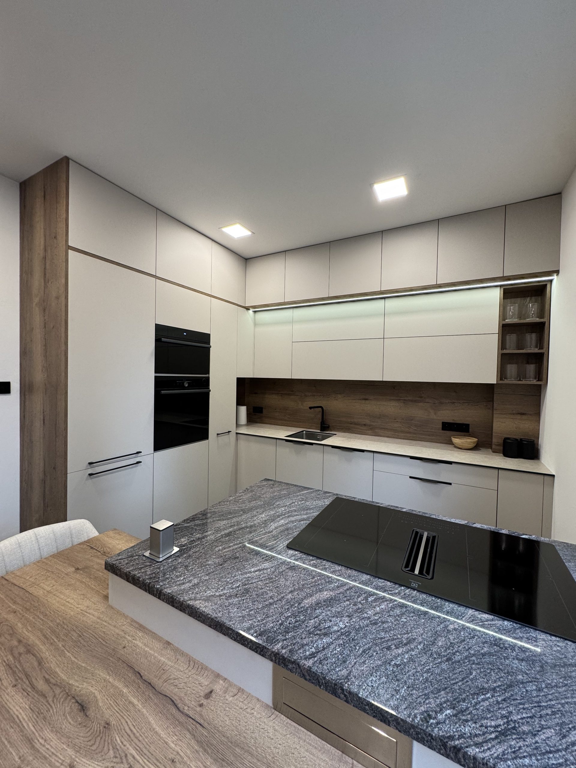 • Kuchyňské linky – zásuvkové systémy, výklopná dvířka a skryté pojezdy pro maximální ergonomii.